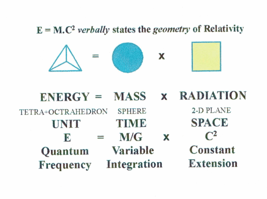 Einstein (soon after University studies) made that Universe-appreciating fundamental discovery. As it is expressed in the alphabetical-numerical equation E = M.C2 it ‘verbally’ conveys the true geometric conditions as generate and assemble every aspect of Universal existence. As he said, it is the simplest formula of science – seen active in everything everywhere organising our daily life.